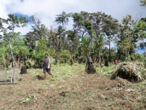 Yesterday, a large group of guys from a three-hours-hike-away village came to help us clear the land where our house is going to be. Yesterday we chatted with them and marked out the area we wanted cleared and then this morning they got to work. It was amazing how much they could accomplish in such little time. I tried my hand at hacking bush with a bush-knife and I managed to cut a few blades of grass without cutting my own leg, but I did come out with a blister on my right hand. We spent most of the morning at work clearing the jungle and then took a break for lunch. After lunch, many of the guys went back to work to finish up, but a few other guys told me to sit with them and learn some “tok ples” (their language). So I sat with them and had them give me 10 different command utterances in the Pal language (You sit down. You stand up. You go outside. You go get the bush knife. Etc.). After I got them written down so I could study later I had one man start giving me the commands and I would obey, if I could remember what I was being commanded to do. After a little while I had mastered those 10 utterances and I asked for 10 more. After mastering the next 10 I went back through the 20 statements and rewrote them as “I” statements (I’m sitting down. I’m standing up. I’m going outside. Etc.). By mid-afternoon the work was done and the group was ready to head home as they had a long walk to make before dark. All in all it was a good day. It was exciting to get started on house building preparation, it was a good time of getting to know some more guys and loosening up with them, and I was able to move just a little bit further along in my knowledge and command of the Pal language. The first picture is the ‘before’ picture of the ground where (Lord willing) our future house will be, and the next two are the ‘during’ and ‘after’ pictures.