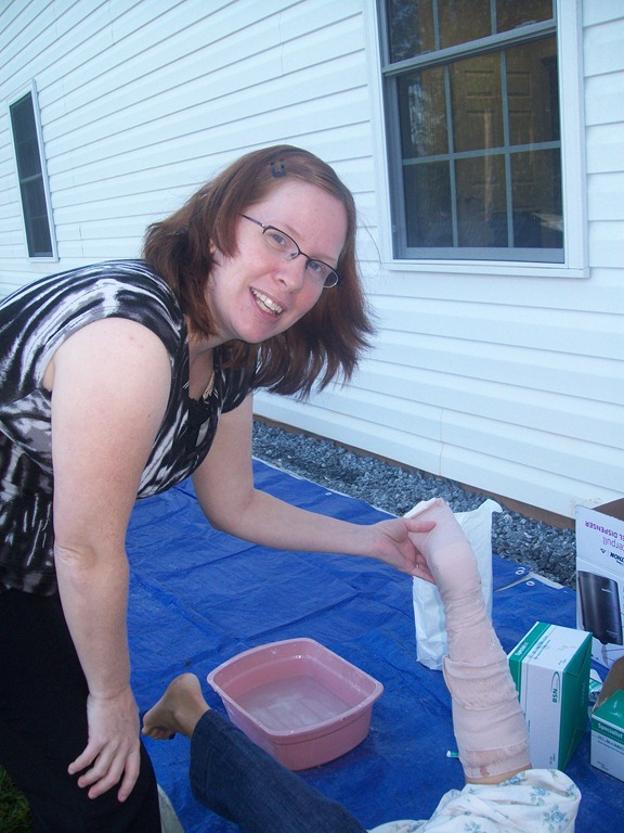 Putting a splint/cast on an ankle.