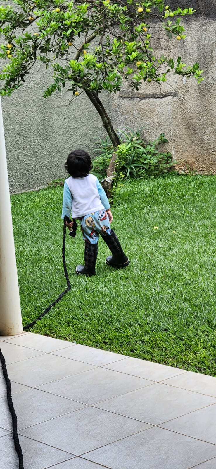 Davi has started music therapy to help with his sensitivity to loud noises, and we are also beginning pre-preschool at home. He already knows eight shapes, twelve colors, how to count to five, and the letter D! We are working on his hand coordination through different activities that will help prepare him for learning to write and use scissors, and we are also doing Puggles. We are focusing on increasing his Portuguese vocabulary as well He is growing like a weed! He absolutely loves our new house, especially the yard and the lemon tree.