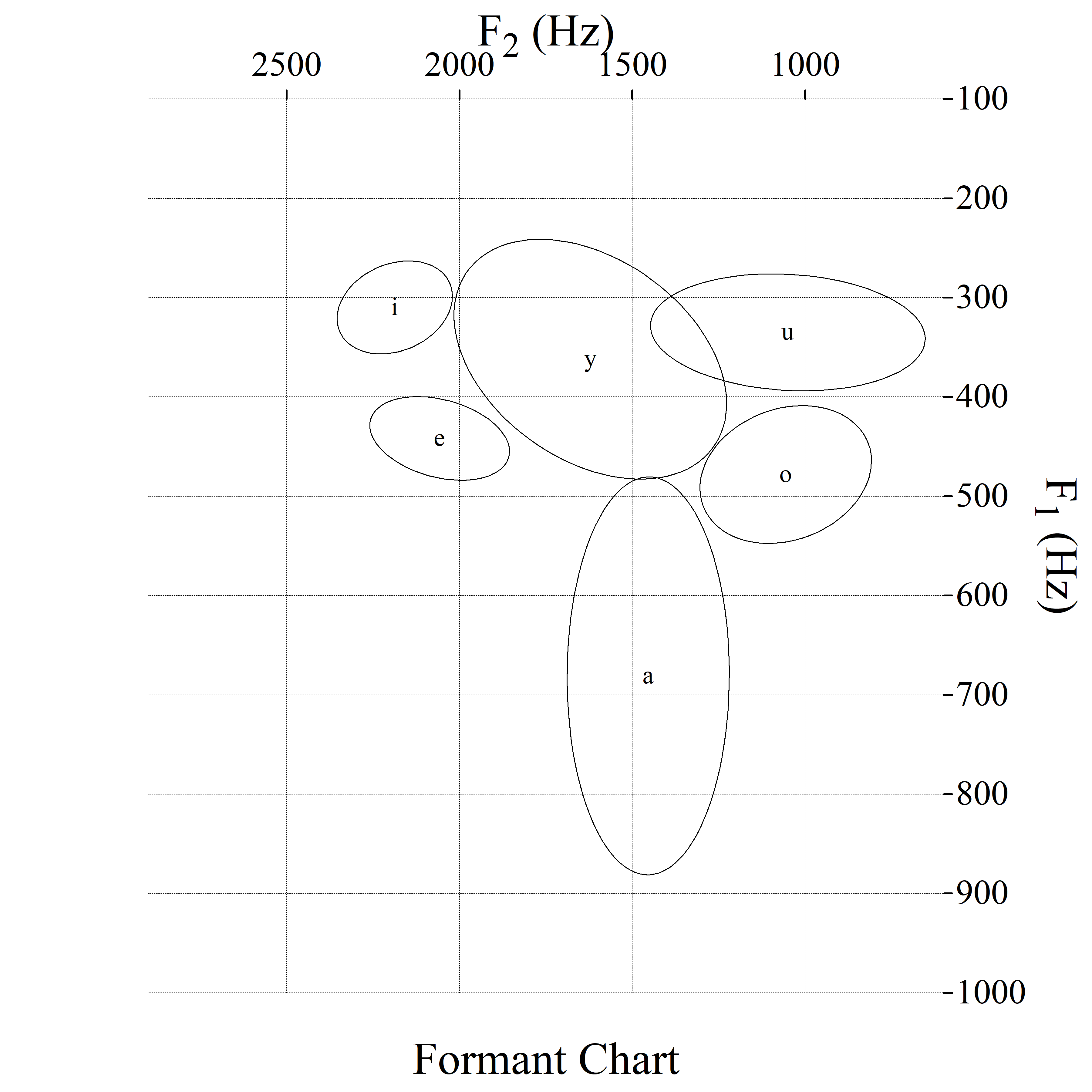 (For linguists out there who happen to read this blog, here’s what the graphs are representations of. For those of you who don’t care, don’t bother reading this. These are acoustic readings of the vowels in a F1/F2 chart (in Hz) showing the midpoint and 2 standard deviations. Again, I’m sure that the ellipses could get much smaller as I fix outliers. For those of you who have taken articulatory phonetics and not acoustic phonetics, you’ll notice that in the nice example, the vowels are laid out about as they are in a vowel chart. That’s because the vowel chart isn’t just a made-up thing, but can actually be graphed by measuring sound waves and the vibrations that occur through the reverberations in your vocal tract before and after the constricted area. That’s totally not the technical terms for it, but hopefully it’s good enough to give you somewhat of an idea of what is happening.)